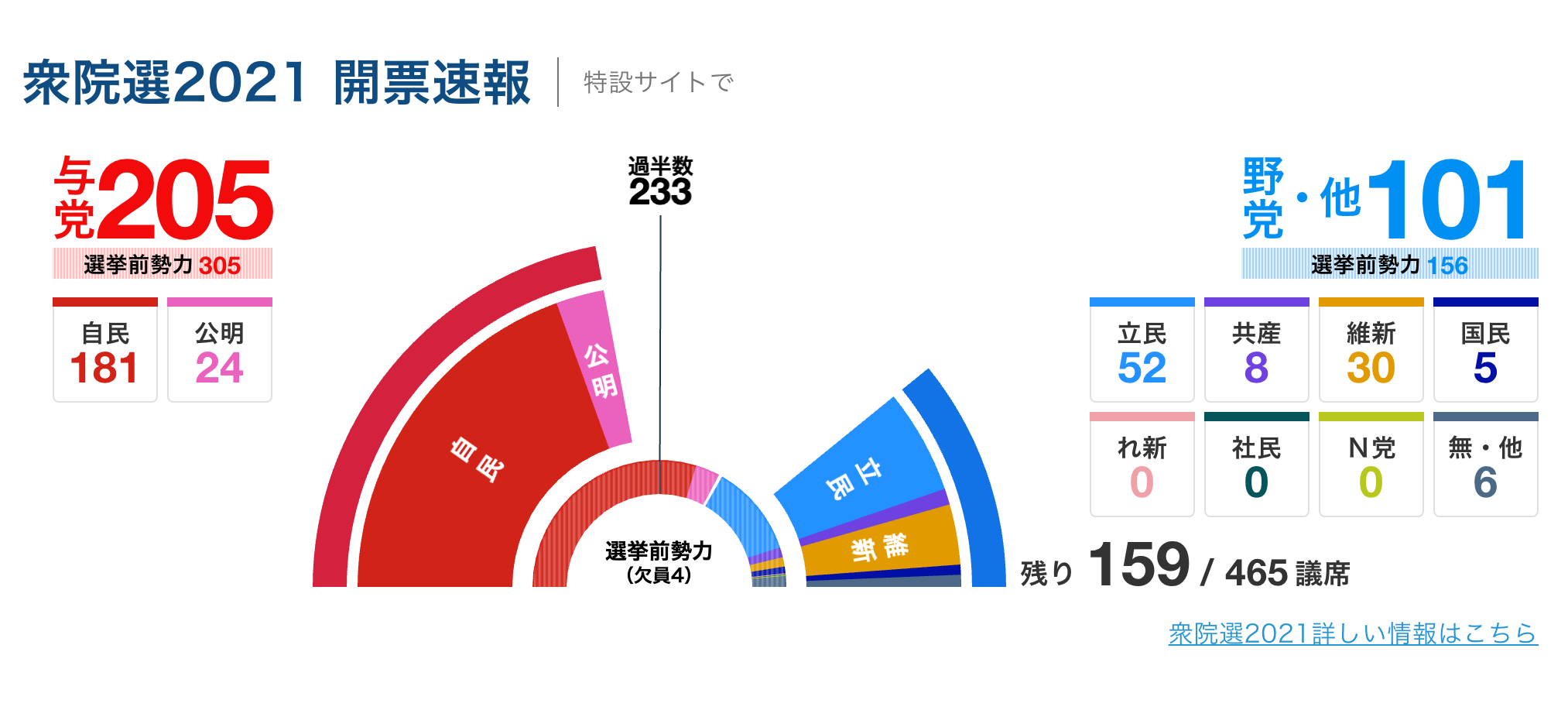 自民党は、石原伸晃元幹事長(東京8区)、平井卓也前デジタル相(香川1区)、桜田義孝元五輪相(千葉8区)ら党幹部や閣僚の経験を持つ「大物」が小選挙区で相次いで敗北確実となった。共闘態勢を構築した野党に抑えられた形だ。立憲民主党は小沢一郎氏(岩手3区)や菅直人元首相(東京18区)といったベテランが自民候補と接戦を展開している。