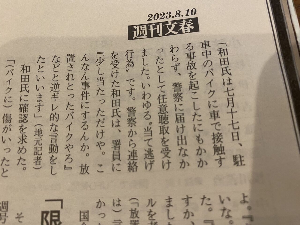 和田氏は七月十七日、駐車中のバイクに車で接触する事故を起こしたにもかかわらず、警察に届け出なかったとして任意聴取を受けました。